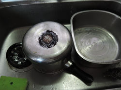 ![]() 調味料を置いている 調理台が…無い | ![]() 鍋もボールもシンクも 磨きます | ![]() こちらも突っ込んだモノを 出します |